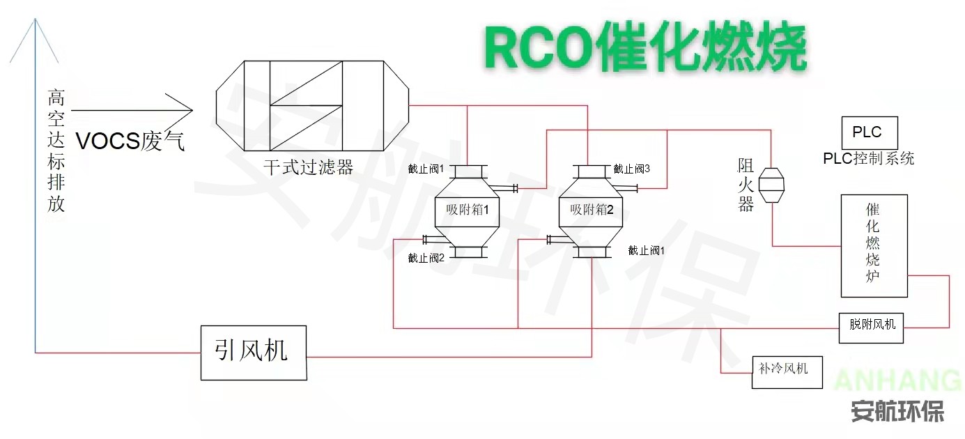 废气由吸尘罩收集,吸尘罩的大小根据废气源的大小来制作,在通过管道在引风机的作用下进入催化燃烧设备处理。为避免颗粒状漆雾影响后续的活性炭吸附过程,尾气入干式预过滤处理装置,将尾气中的颗粒状污染物截留下来,再进入活性炭吸附床进行吸附处理,废气中的气态污染物被吸附在活性炭表面,而干净的气流沿管道高空排放。经过一段时间的吸附,活性炭对污染物吸附达到程度后,启动系统的活性炭脱附,将原来吸附在活性炭里的废气脱附出来,通过催化燃烧将气态污染物转化成二氧化碳和水蒸汽,经处理后的气流高空达标排放。