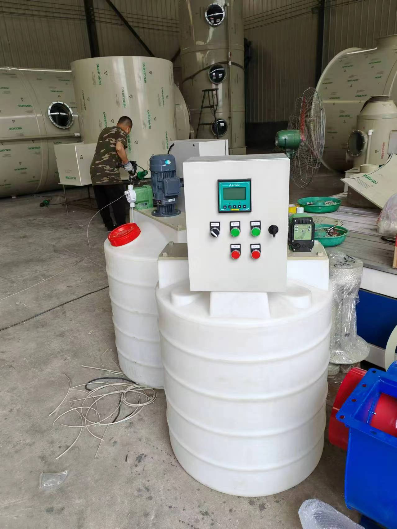 加药设备上的LLDPE储药桶,其上面有搅拌机,液位计,加药计量泵等设备的加固安装定位孔,容量从40L到10000L不等。